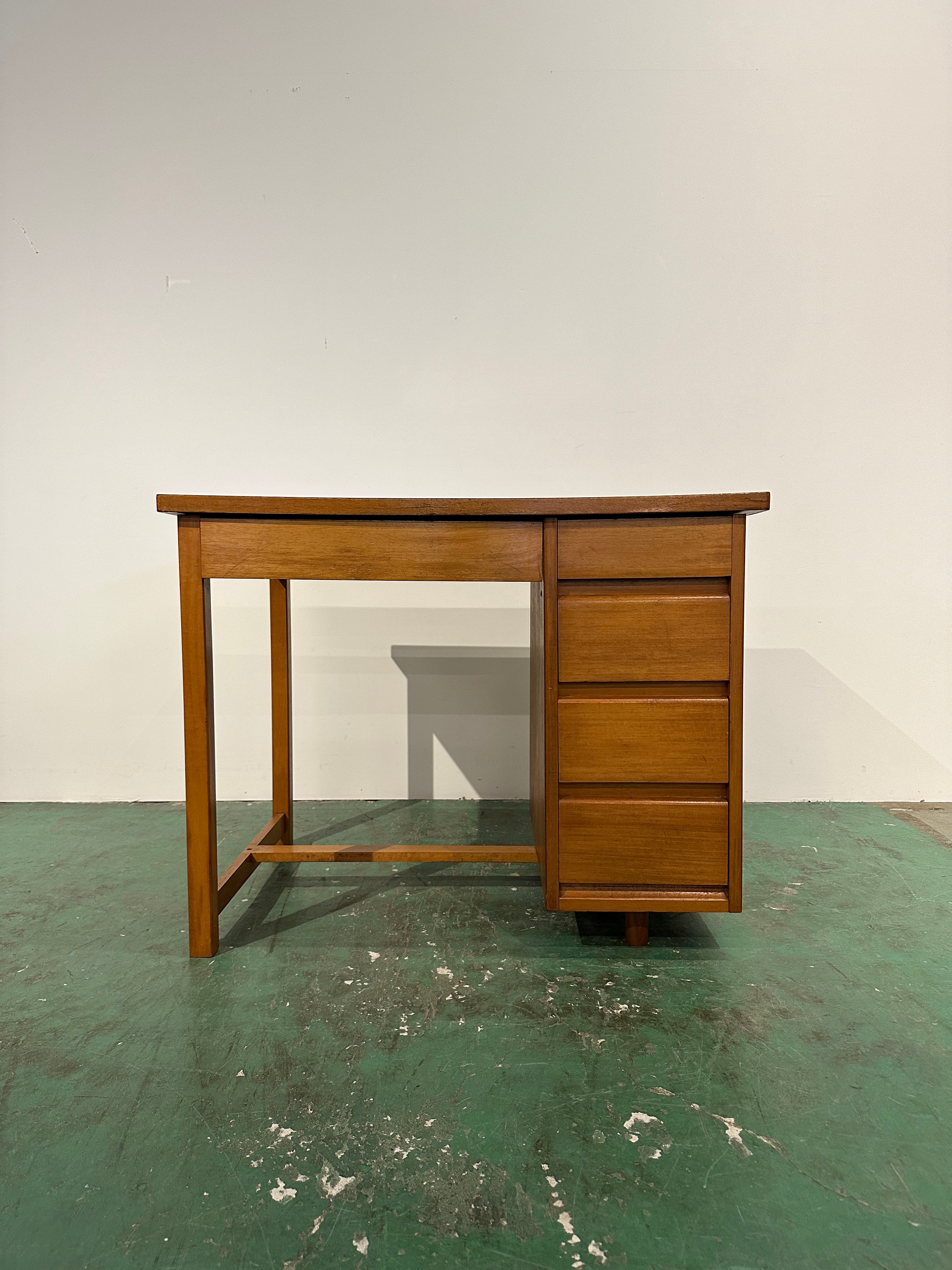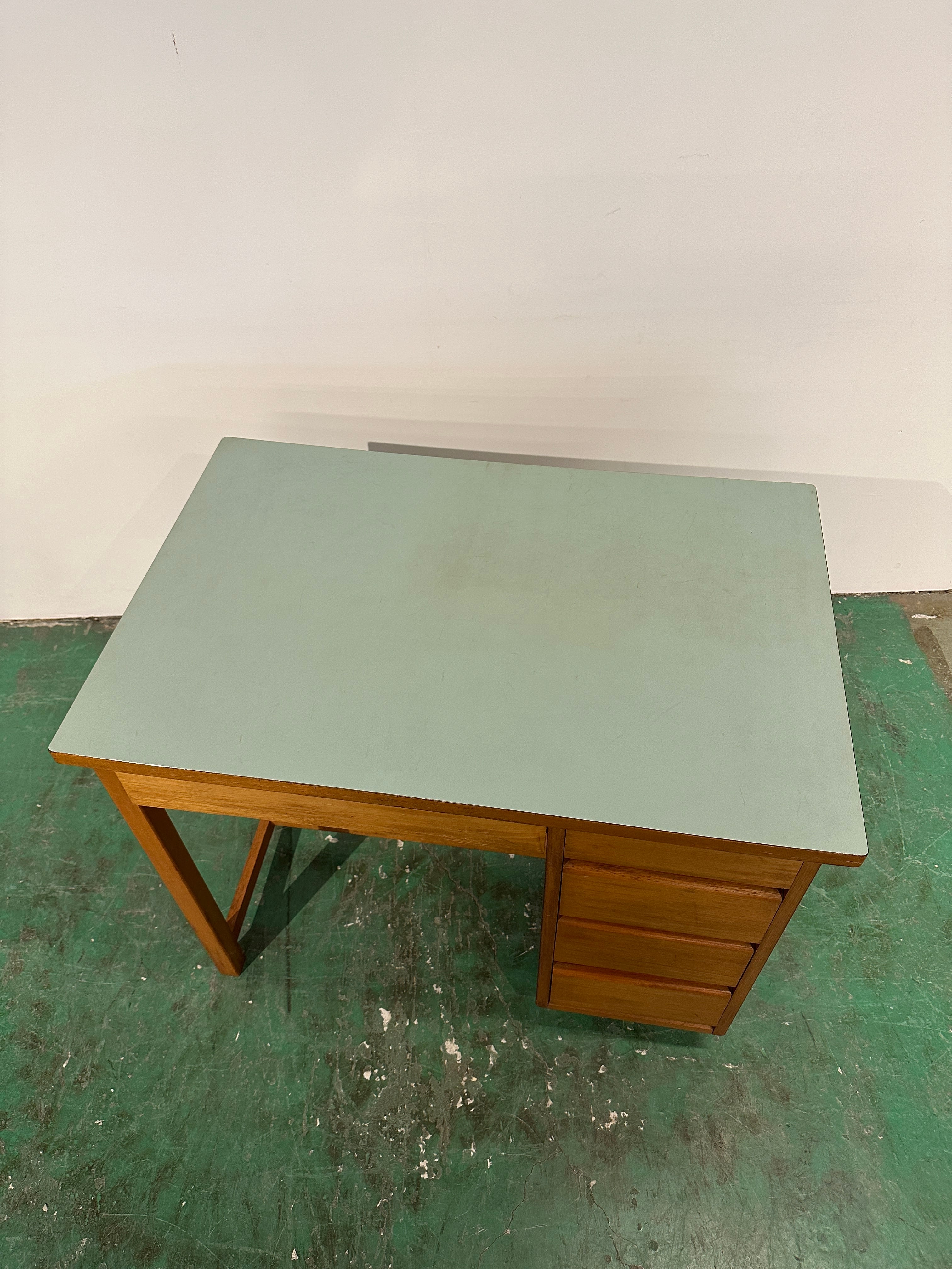 ライトグリーンの天板が目を惹く片袖机です。